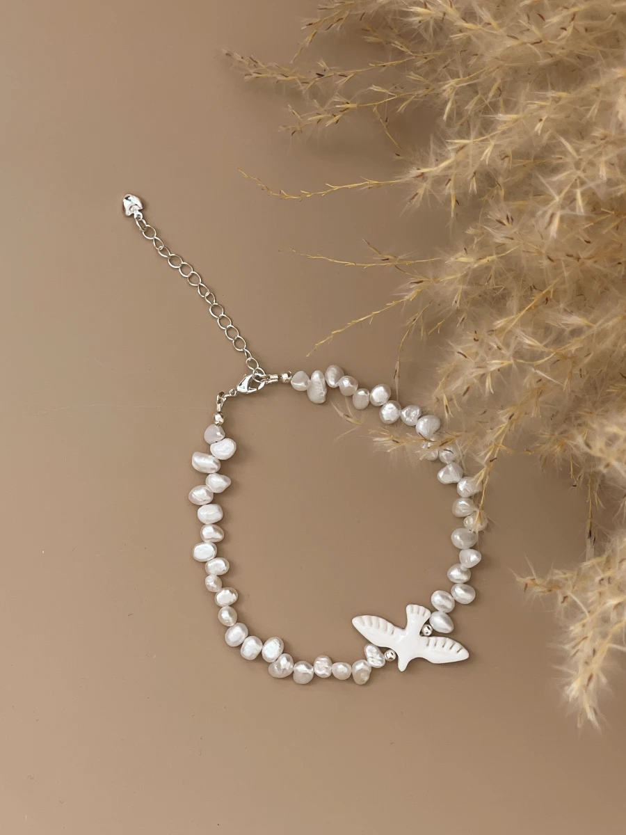 Цей витончений браслет на ніжку втілює легкість і граціозність. Унікальна пташка, виконана з полімерної глини, майстерно поєднується з бароковими перлами, які варіюються за кольором та текстурою, створюючи неповторний вигляд. Кожен перлиний елемент відрізняється своїм природним відтінком, додаючи чарівної асиметрії в композицію.