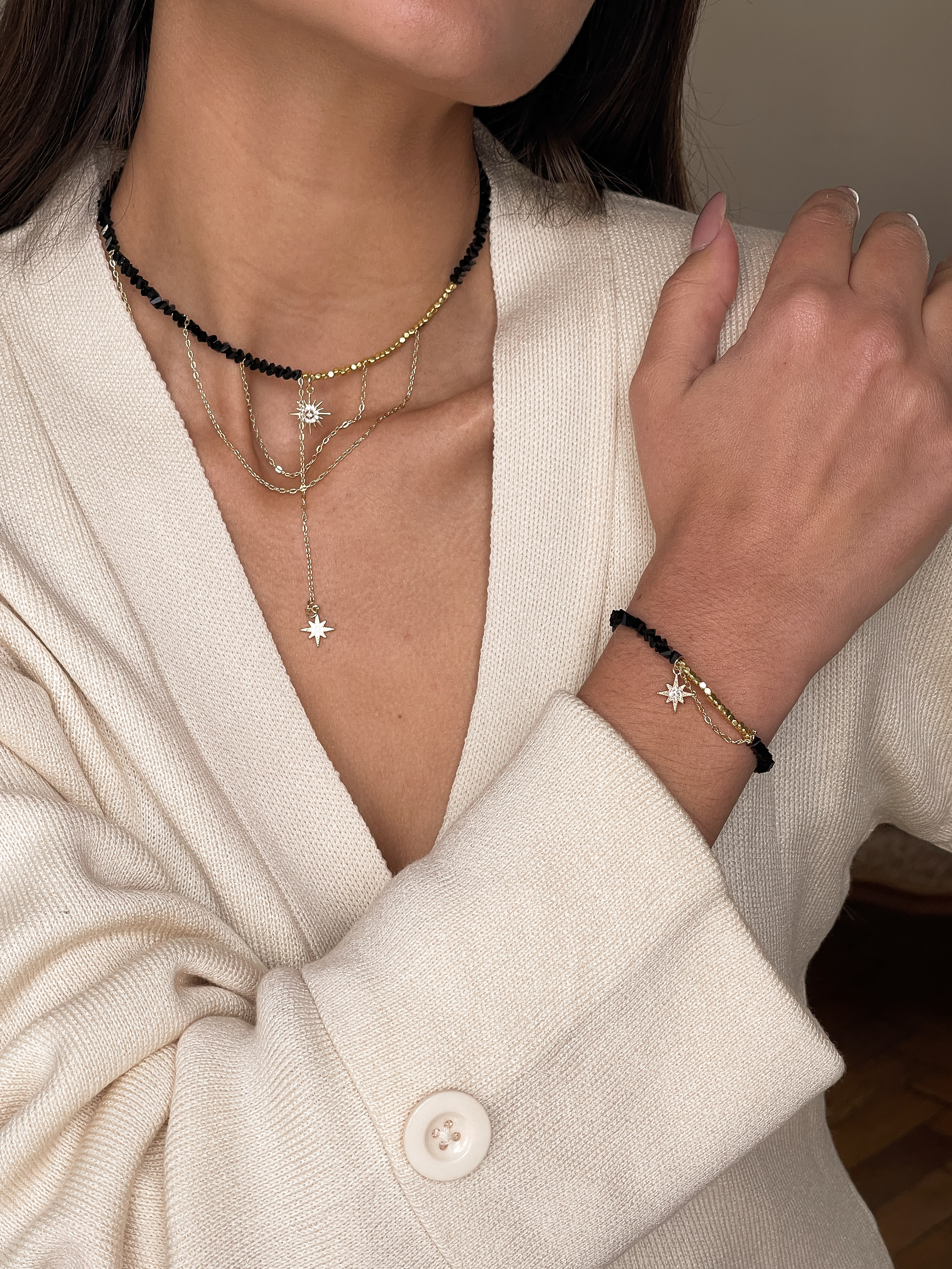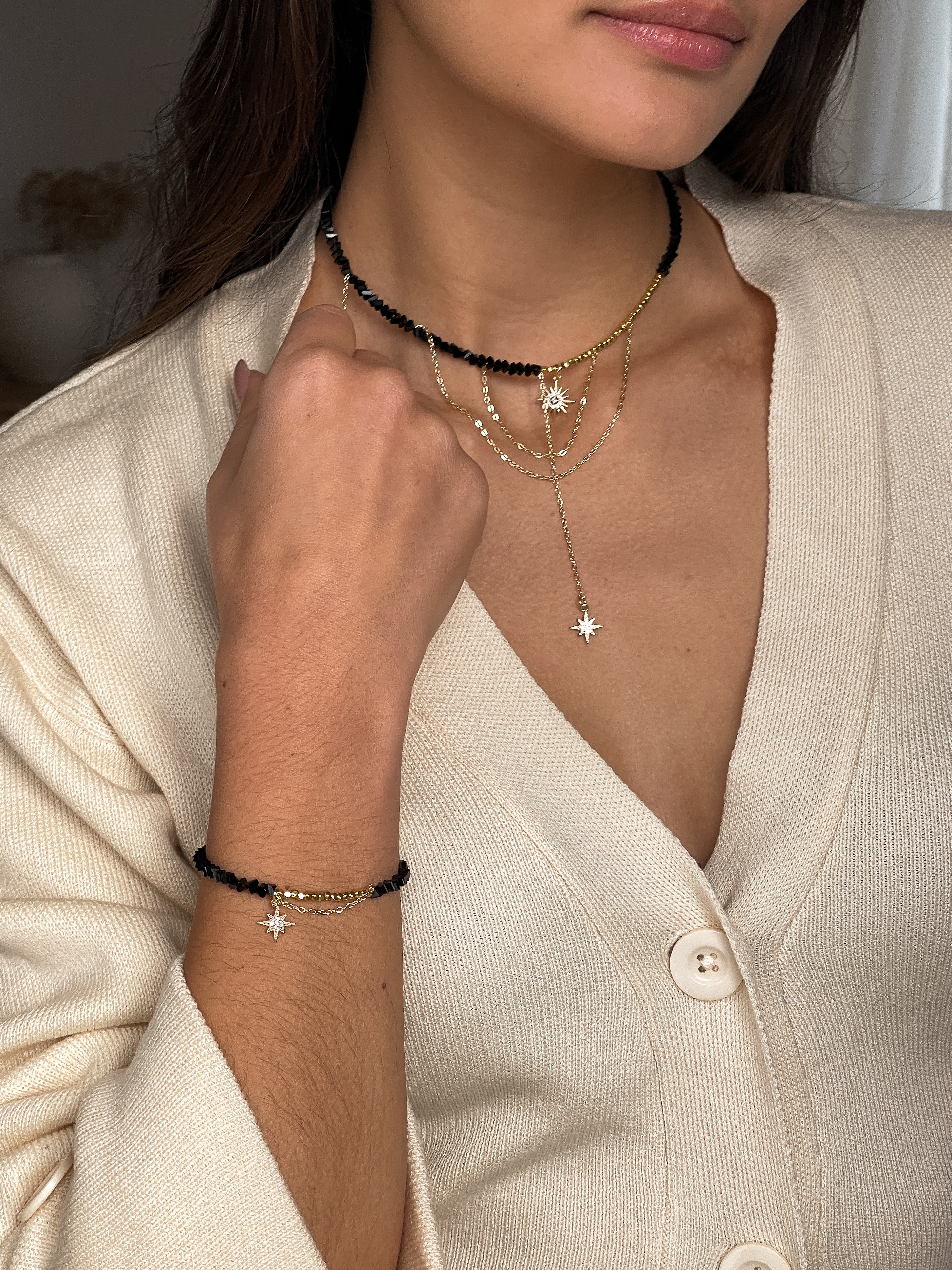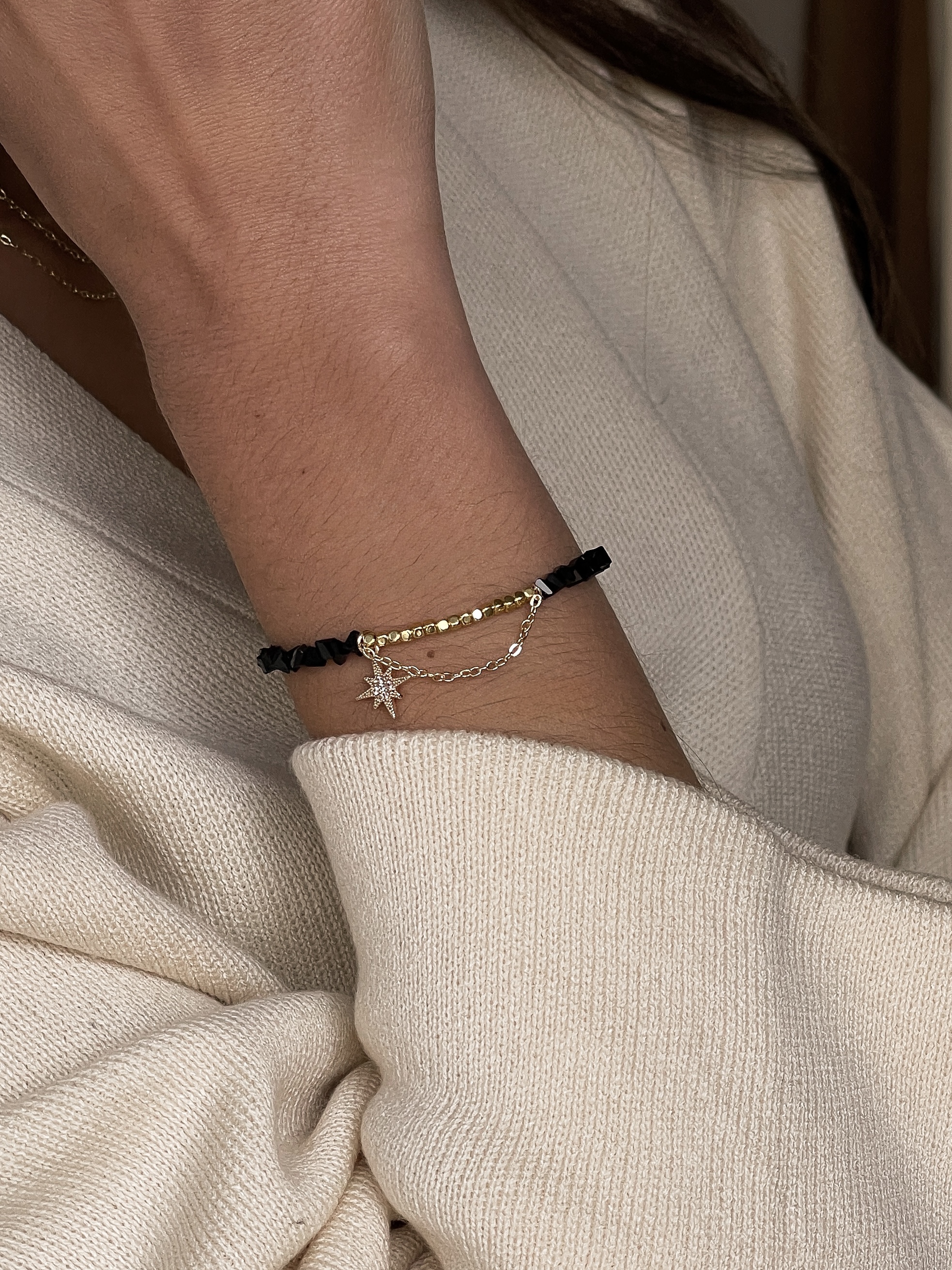 Застібка-карабін і подовжувач 5 см забезпечують комфортне носіння та регулювання довжини. Цей браслет гармонійно доповнює кольє “Чорні Зірки”, утворюючи стильний і витончений ансамбль для будь-якого образу.