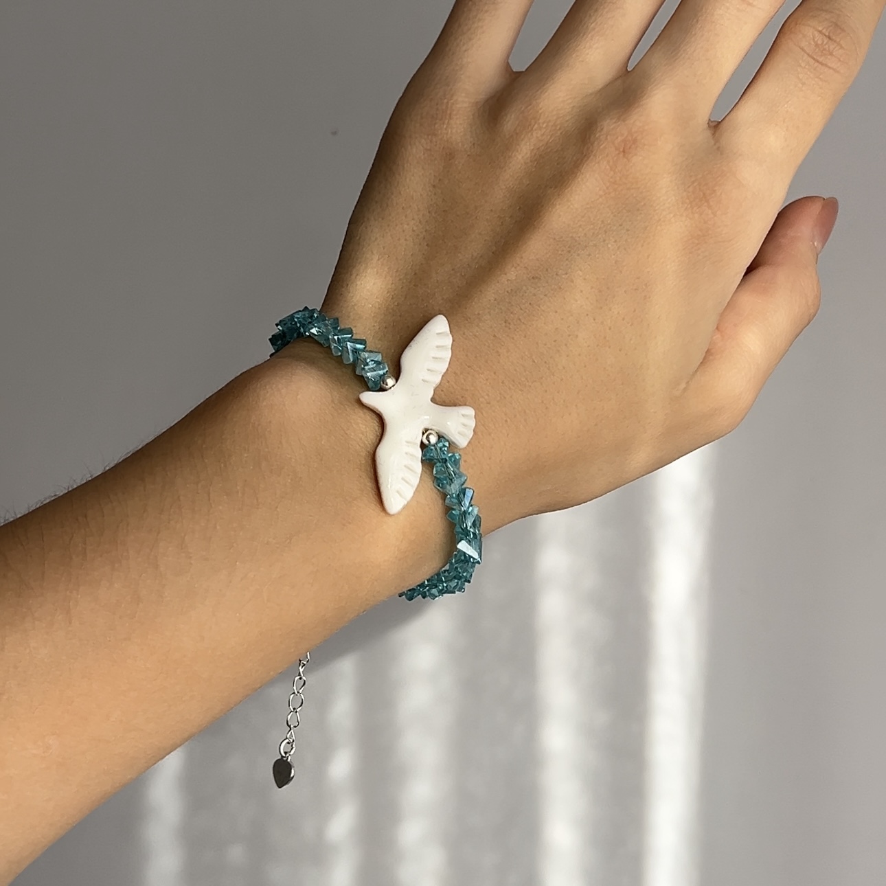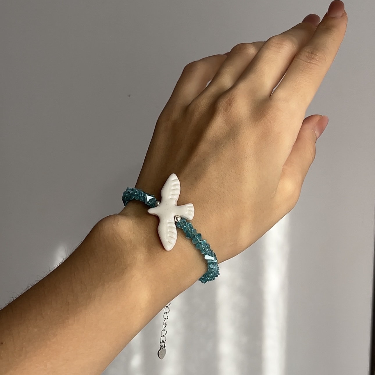 Браслет “Крижана Горлиця” — ніжний аксесуар, що поєднує прохолоду бірюзового скла з білизною символічної горлиці. Виконаний із медичного сплаву, полімерної глини та ювелірного скла. Має подовжувач 5 см для комфортної посадки на зап’ясті. Підійде як для щоденного носіння, так і для особливих моментів.