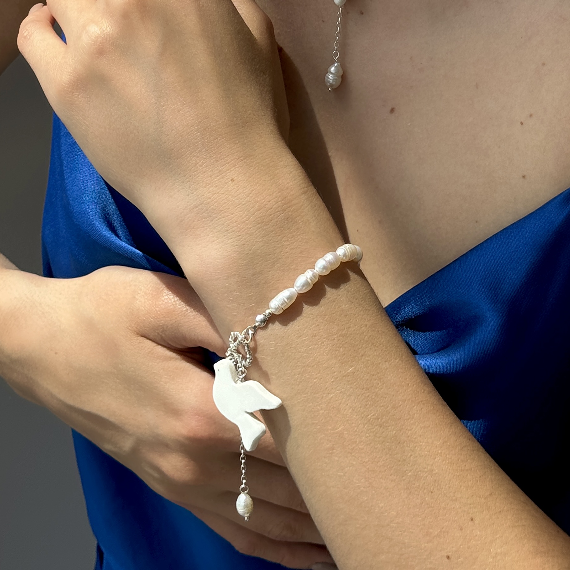 Браслет Silver Eco поєднує природну красу еко-перлів і витонченість полімерної глини. Срібне покриття додає вишуканого блиску, а застібка-тогл забезпечує зручність і надійність. Цей браслет створений для тих, хто цінує мінімалізм, природність і сучасний дизайн. Ідеально пасує як до вечірнього образу, так і до щоденного стилю.