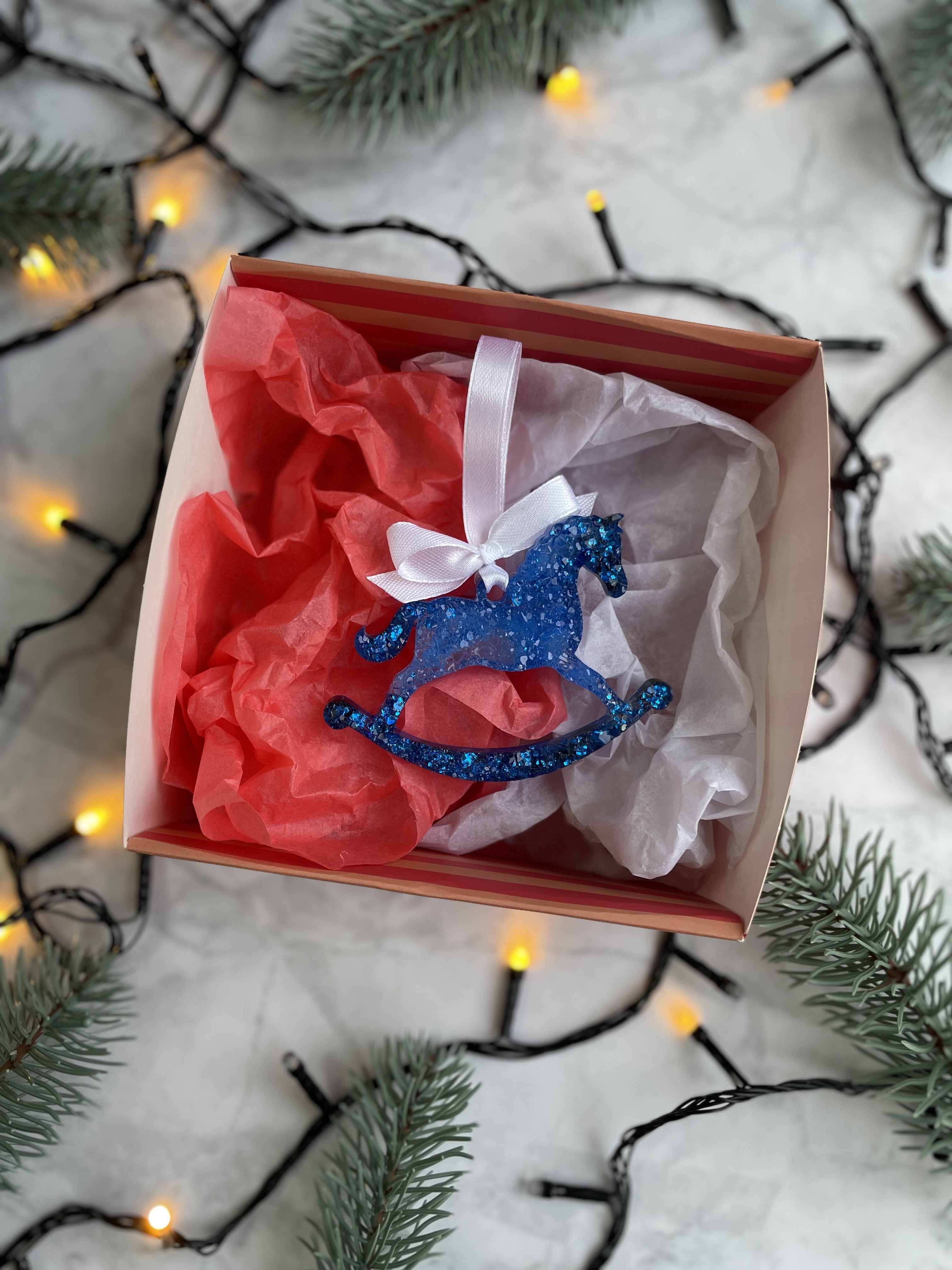 Іграшка «Синій Коник» — яскрава та казкова ялинкова прикраса, що привертає увагу глибоким синім відтінком та іскристими деталями. Виготовлена з якісної епоксидної смоли, вона вирізняється міцністю, гладкою поверхнею та ефектним переливанням. Атласна стрічка додає ніжності та дозволяє легко підвісити коника на ялинку чи святковий декор.