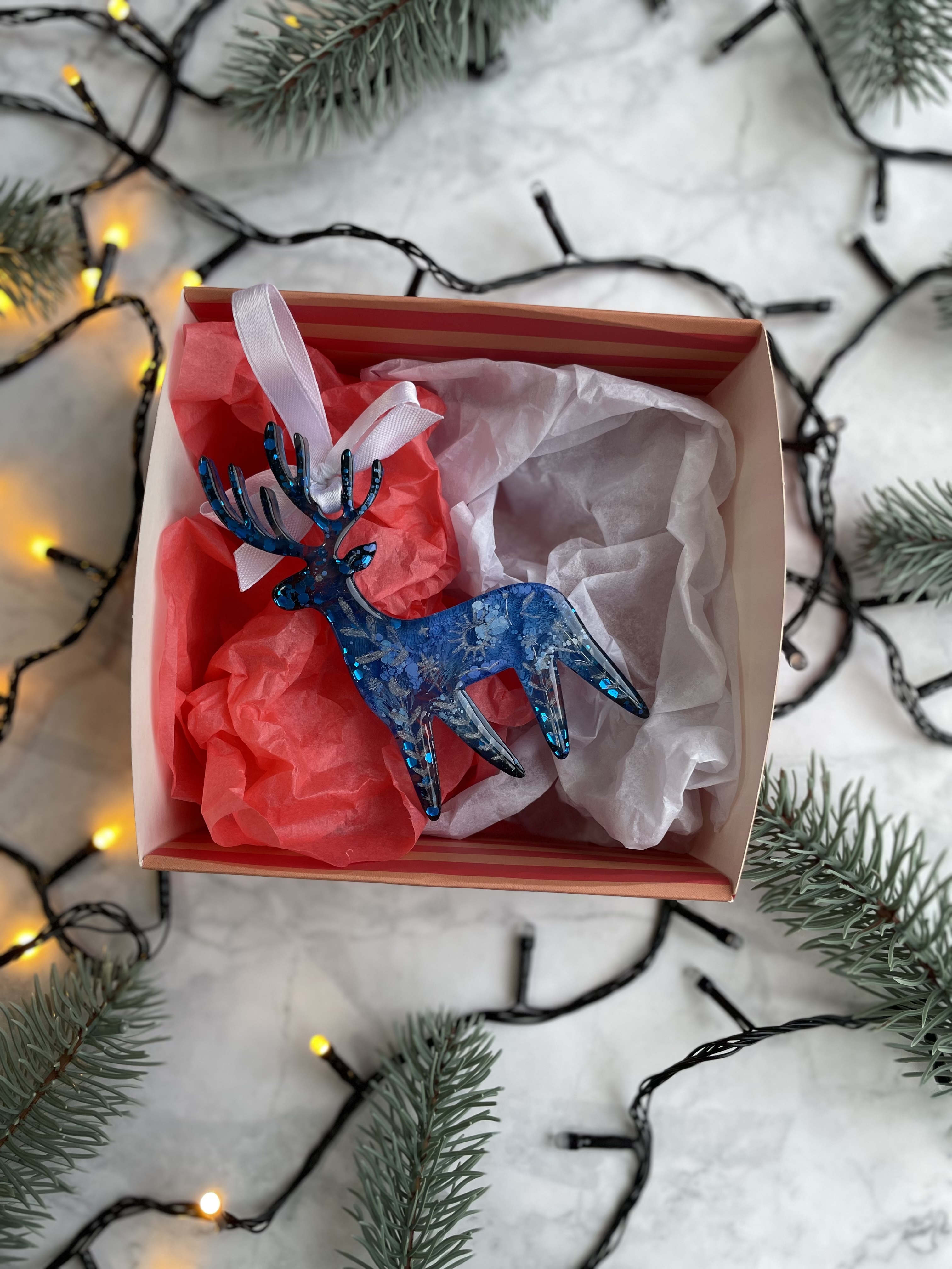 Іграшка «Синій Олень» — витончена новорічна прикраса, що додає святковому декору магії зимового лісу. Виготовлений із прозорої епоксидної смоли з декоративними вкрапленнями, олень має глибокий синій відтінок і ефектне переливання. Атласна стрічка дозволяє легко підвісити його на ялинку, гірлянду або подарункову упаковку.