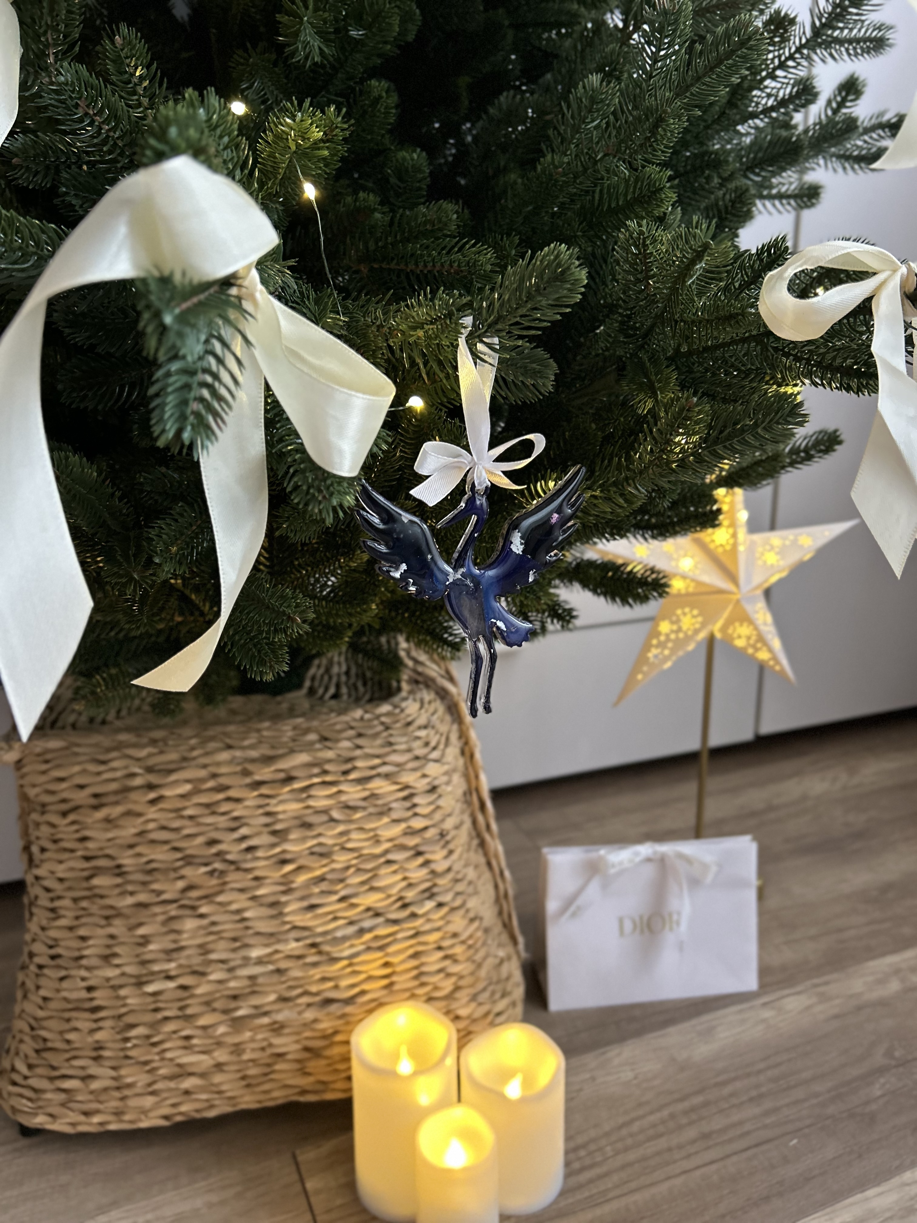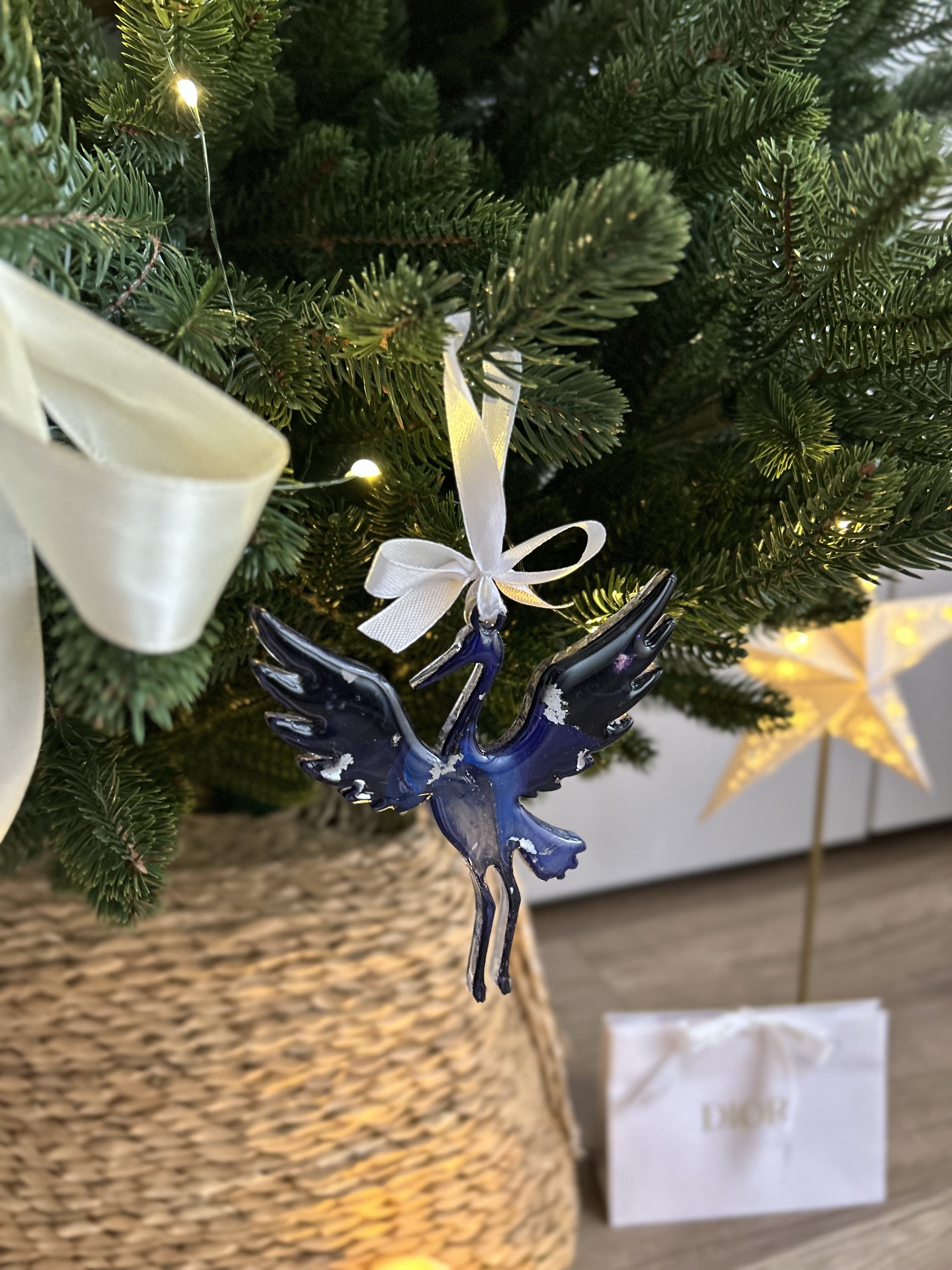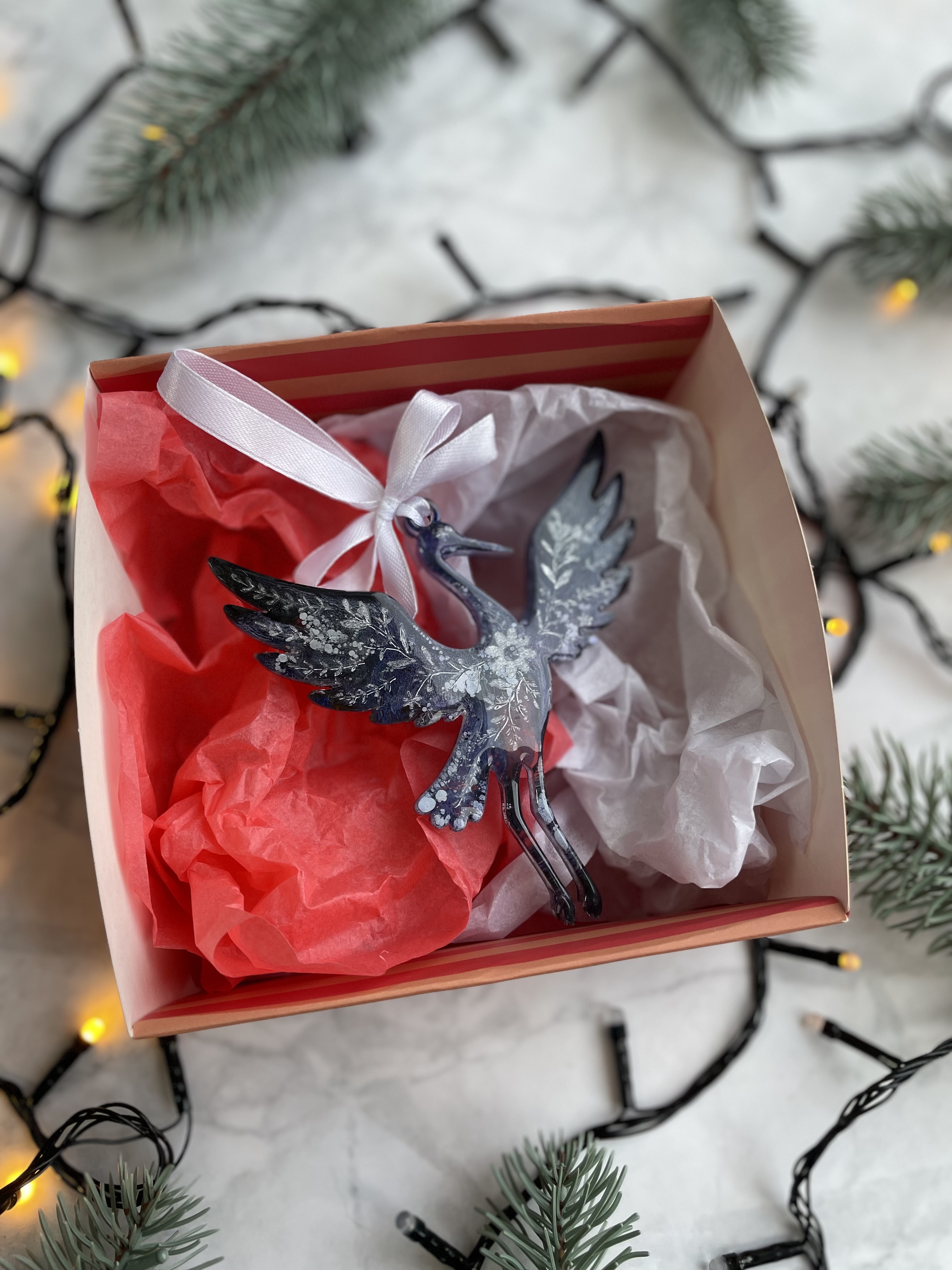 Елегантна ялинкова іграшка «Журавель» — стильний акцент для вашого святкового декору. Виготовлена з якісної епоксидної смоли, вона має виразну форму, глибокий колір і делікатний блиск. Атласна стрічка додає ніжності та дозволяє легко підвісити прикрасу на ялинку, вінок чи гірлянду.