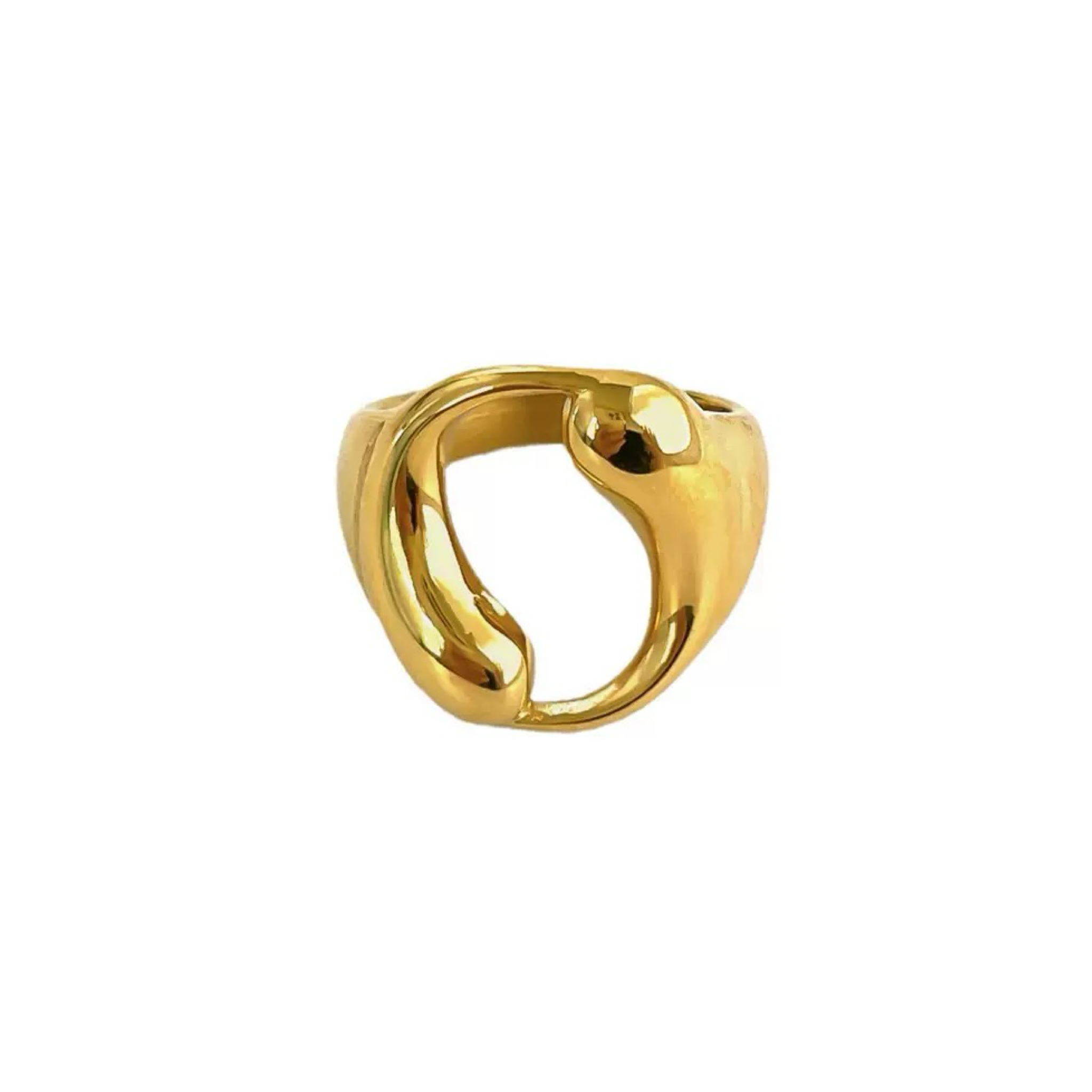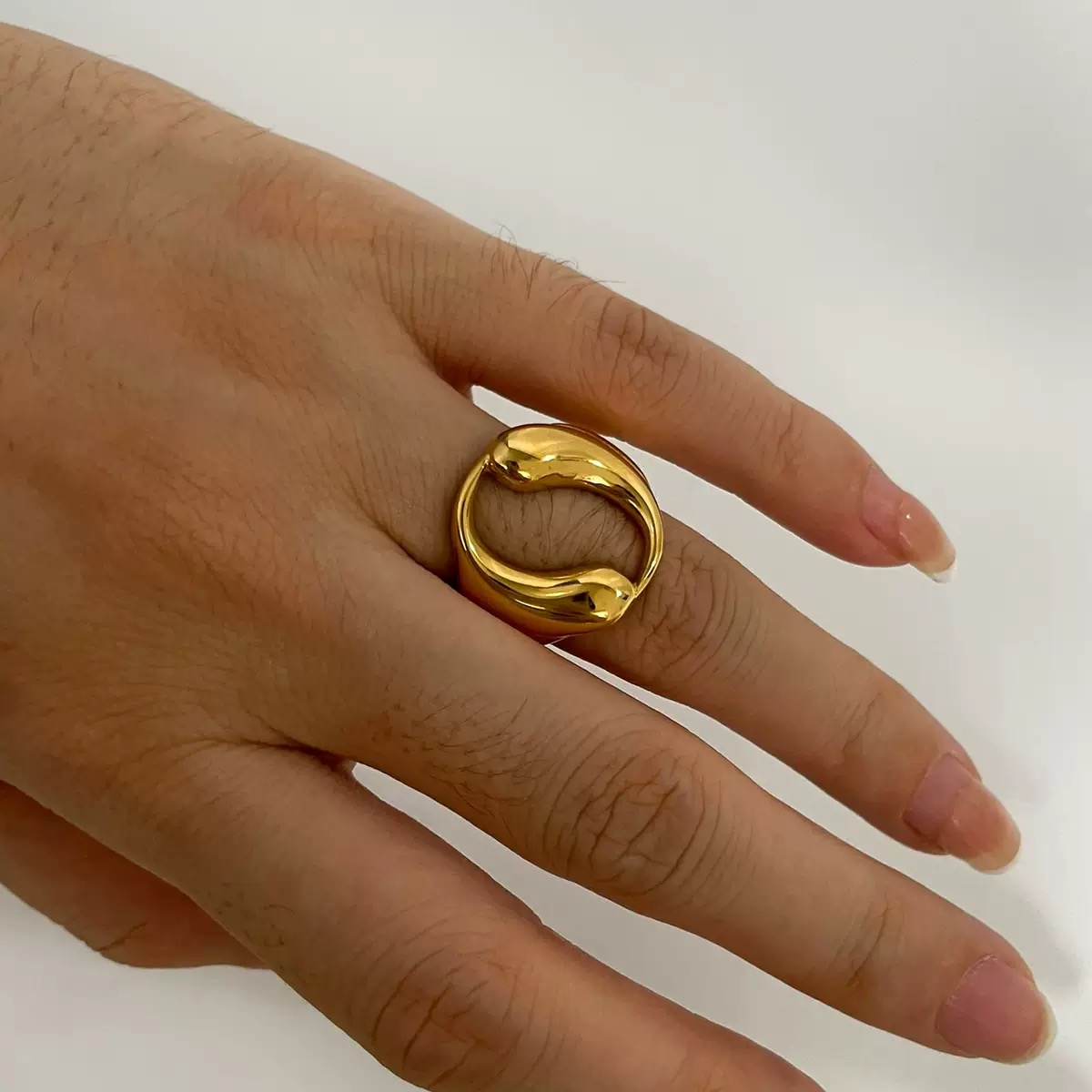 Елегантна каблучка з неповторним дизайном, виготовлена з медичного сплаву з позолоченим покриттям. Її витончені лінії і сяючий блиск додадуть особливого шарму вашому образу. Ідеальний вибір для сміливих та стильних!