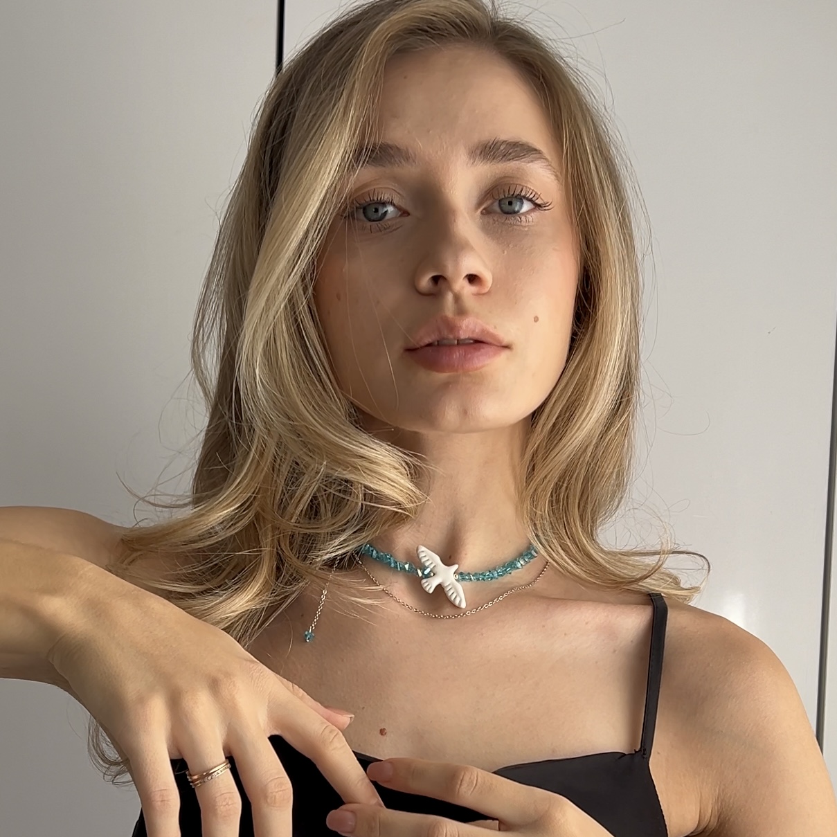 Кольє “Крижана Горлиця” — витончена прикраса з поєднанням холодного сяйва блакитного скла та ніжності білої горлиці. Створене з медичного сплаву, полімерної глини та ювелірного скла. Має подовжувач 5 см для зручної посадки. Ідеальне доповнення до романтичного або святкового образу.