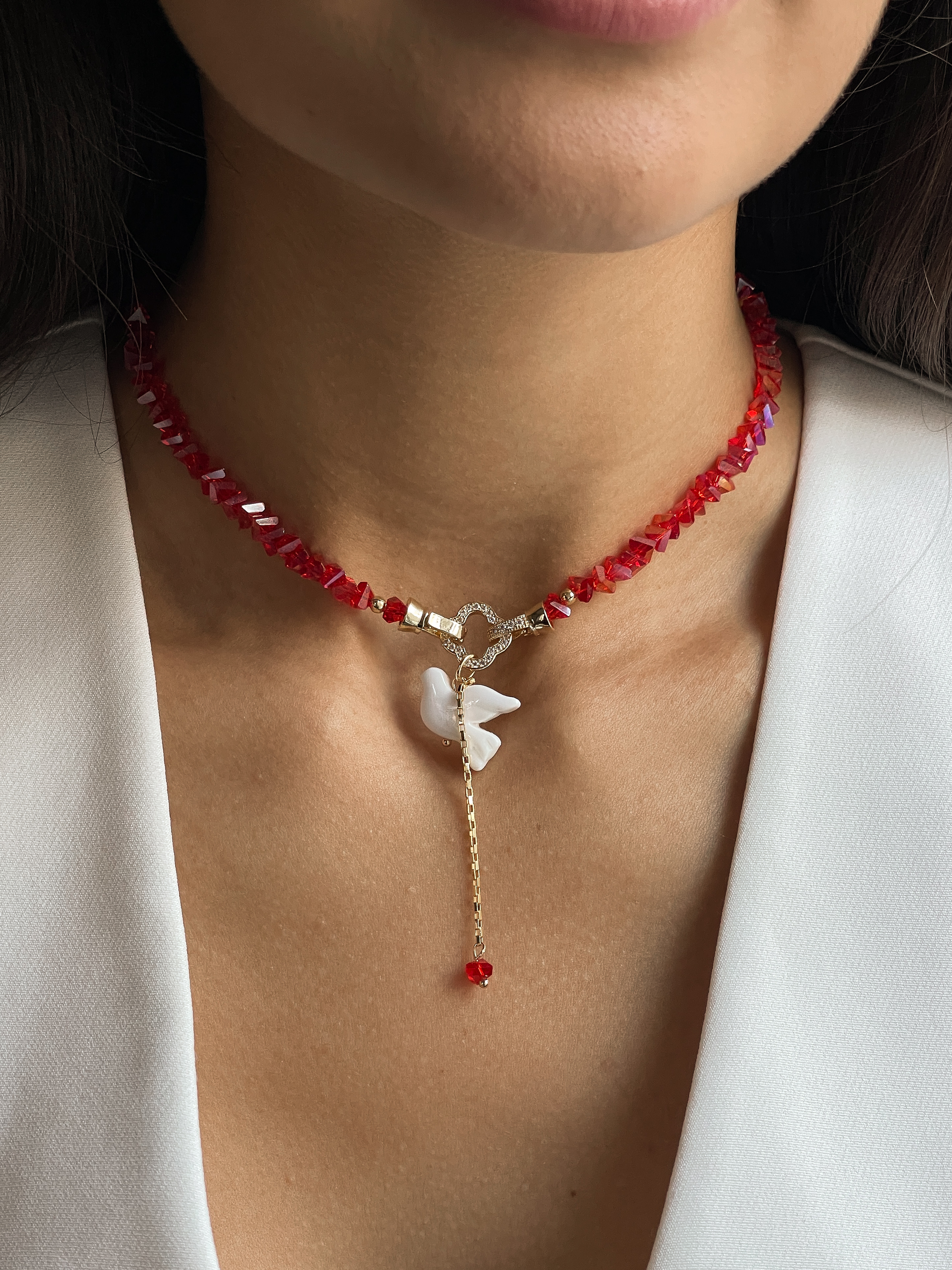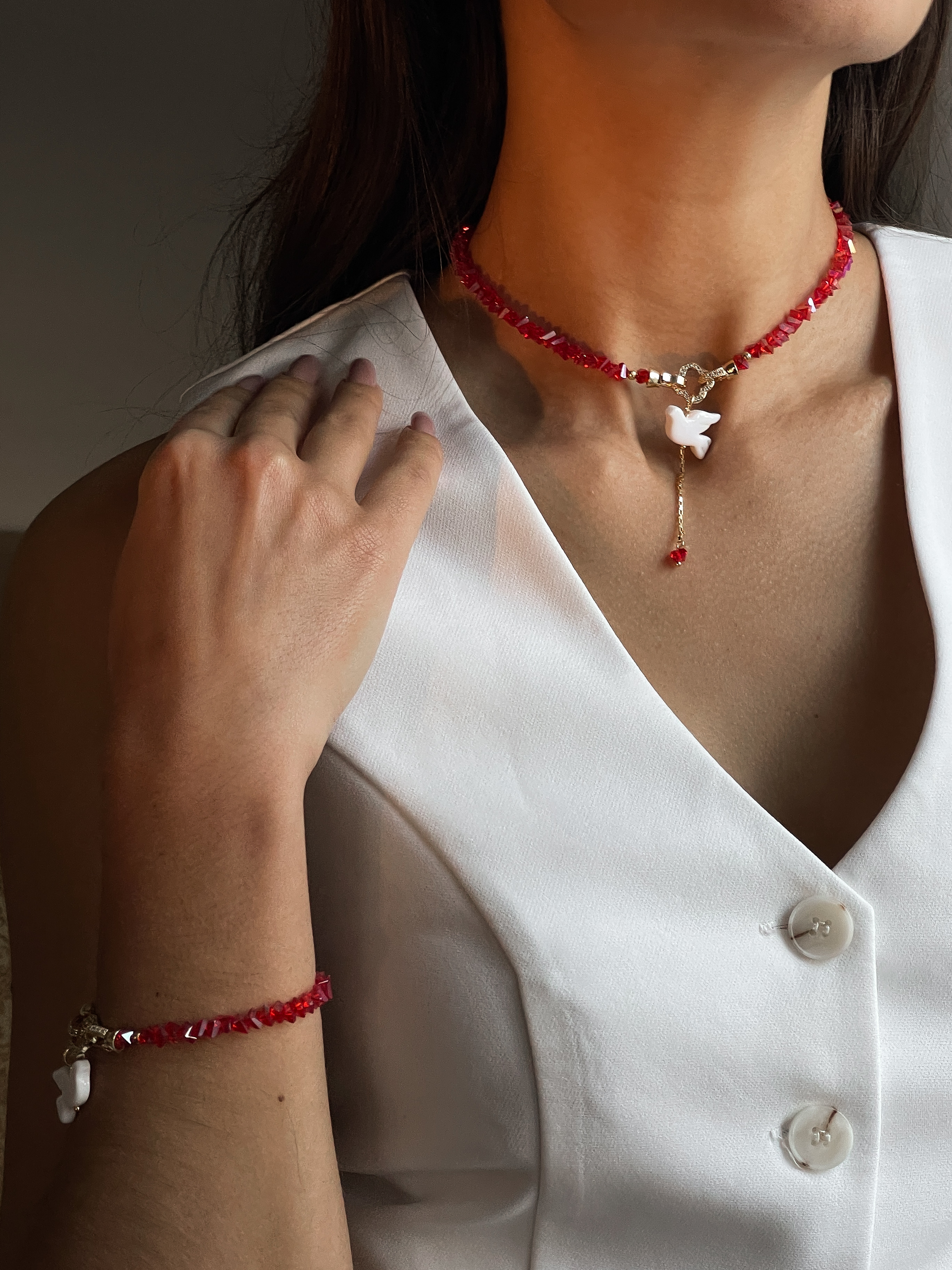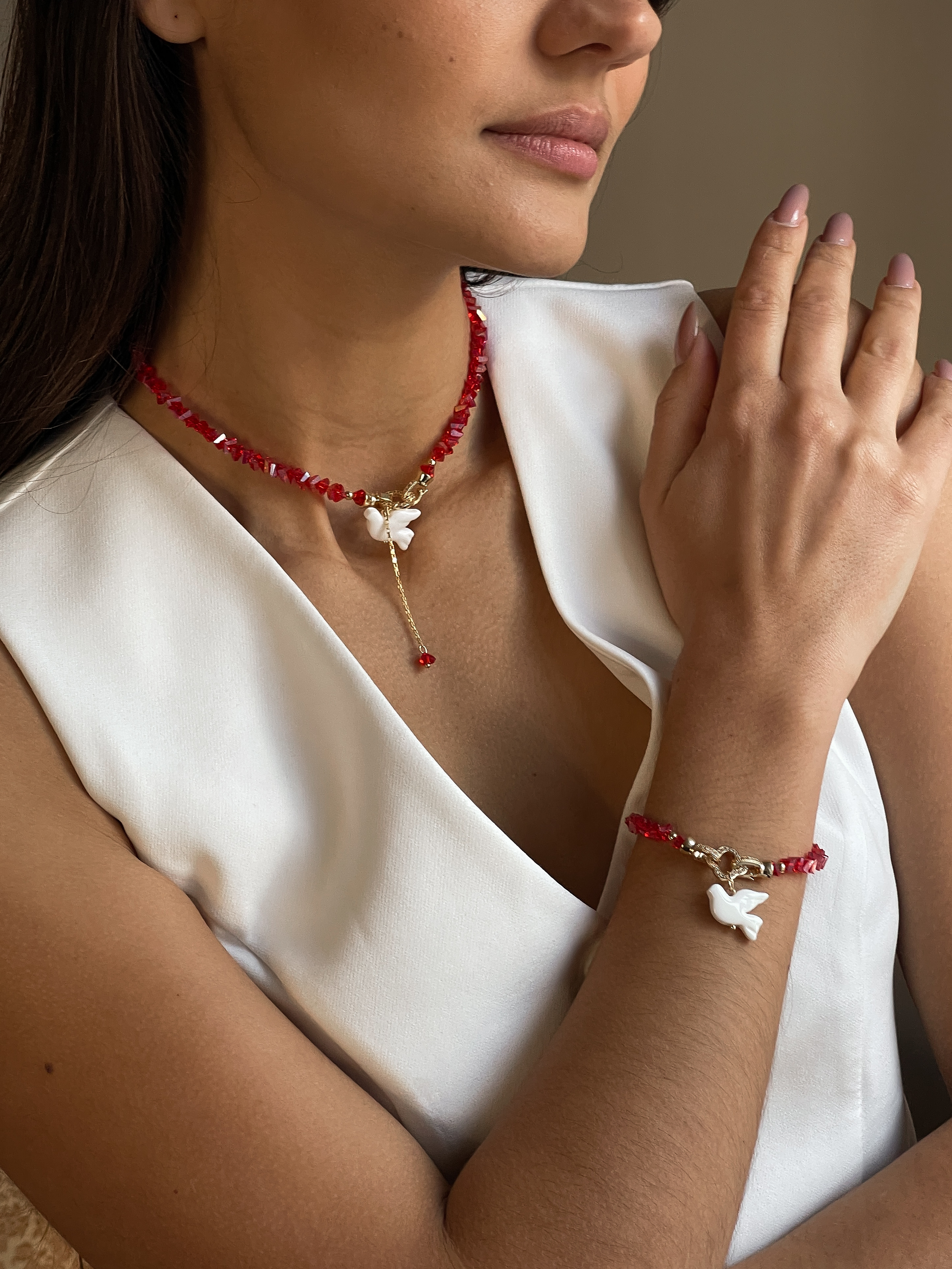 Кольє “Red Горлиця” — виразна прикраса, сповнена символізму та енергії. Яскраві камінці з ювелірного скла створюють ефект сяйва, а позолочені елементи додають виробу вишуканості. Центральний кулон у формі горлиці, виконаний із полімерної глини, символізує мир і ніжність, а фіаніти надають легкого блиску.