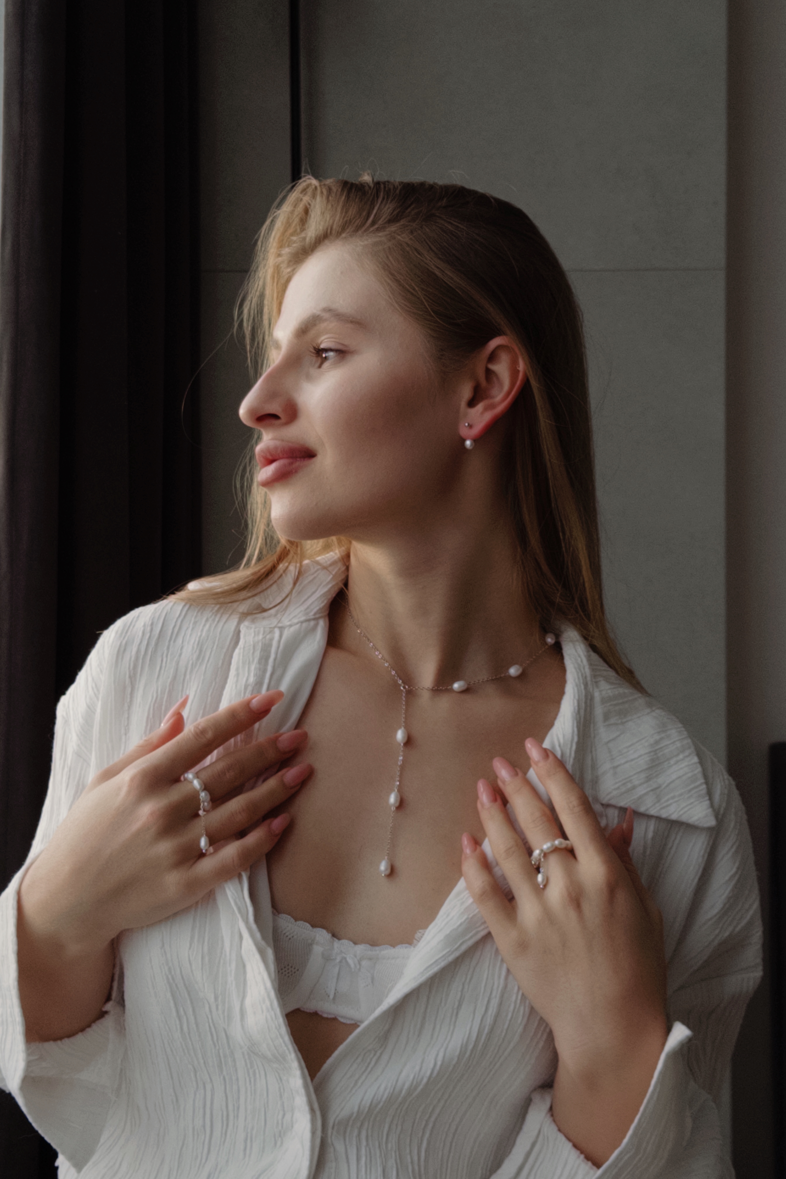 Кольє “Витончені Перли” — символ класичної елегантності та жіночої ніжності. Прикраса створена з річкових перлів, що мають природний блиск і неповторну форму, та медсплаву зі срібним покриттям, яке додає витонченого сяйва.
