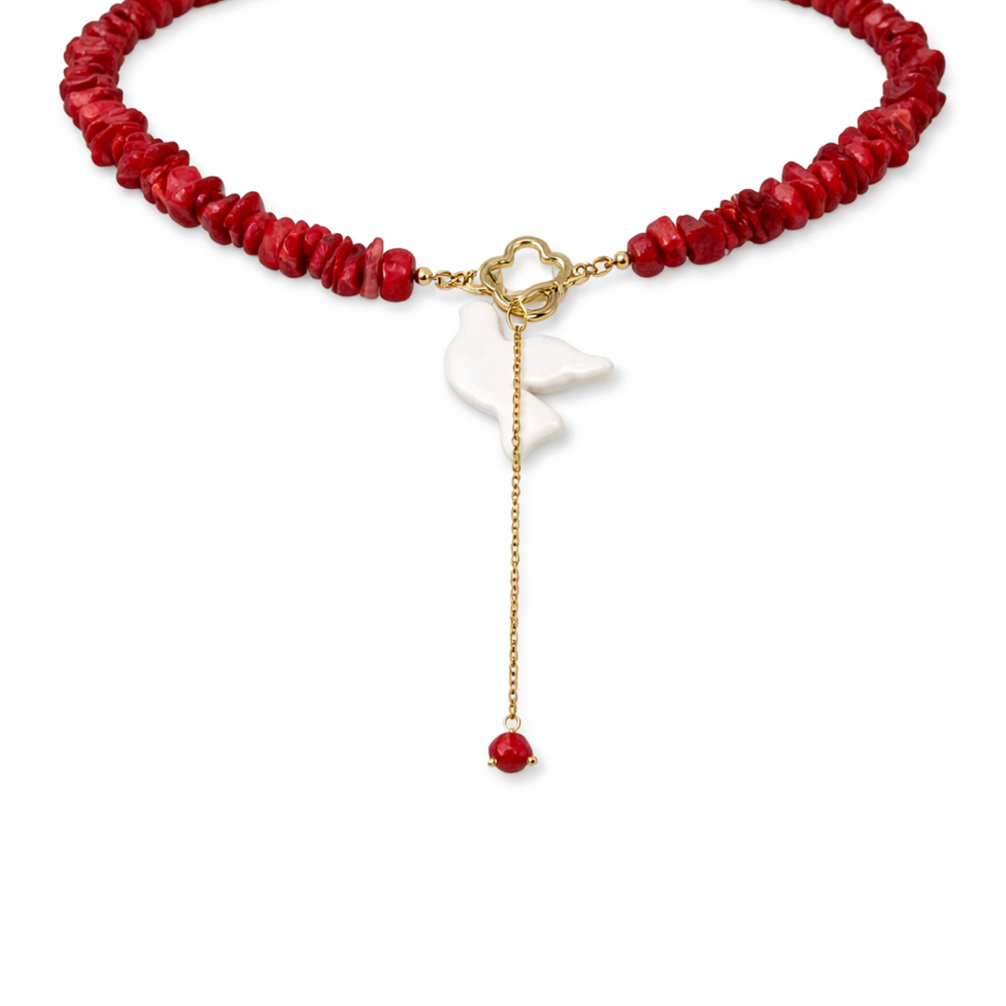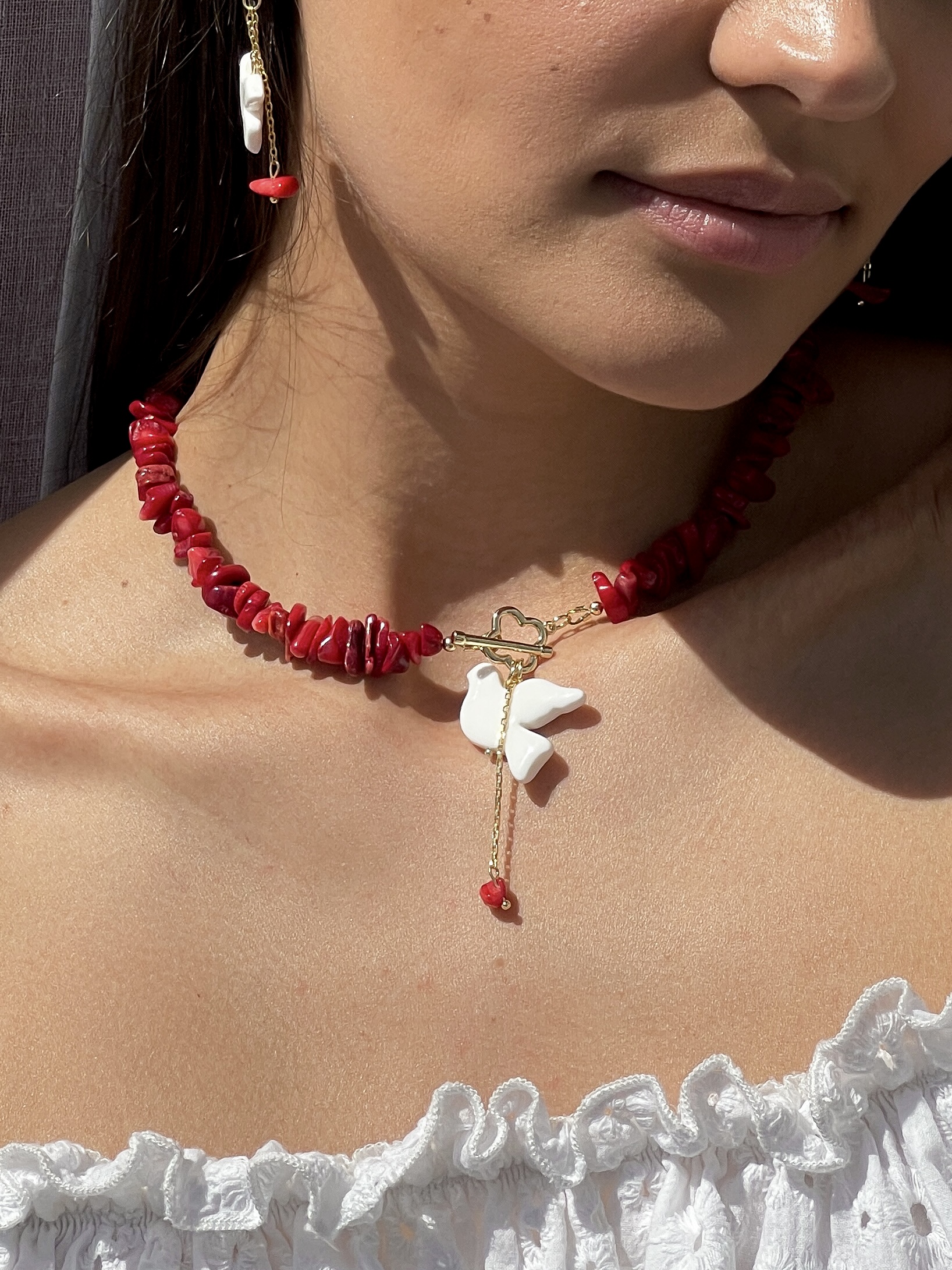 Кольє "Оксамитова Горлиця" — витончене поєднання природної краси та авторського стилю. Створене з медсплаву з позолотою, натурального коралу та елементів з полімерної глини. Оригінальна тогл-застібка додає шарму, а відсутність подовжувача підкреслює лаконічність дизайну. Ідеальне доповнення до образів із характером.