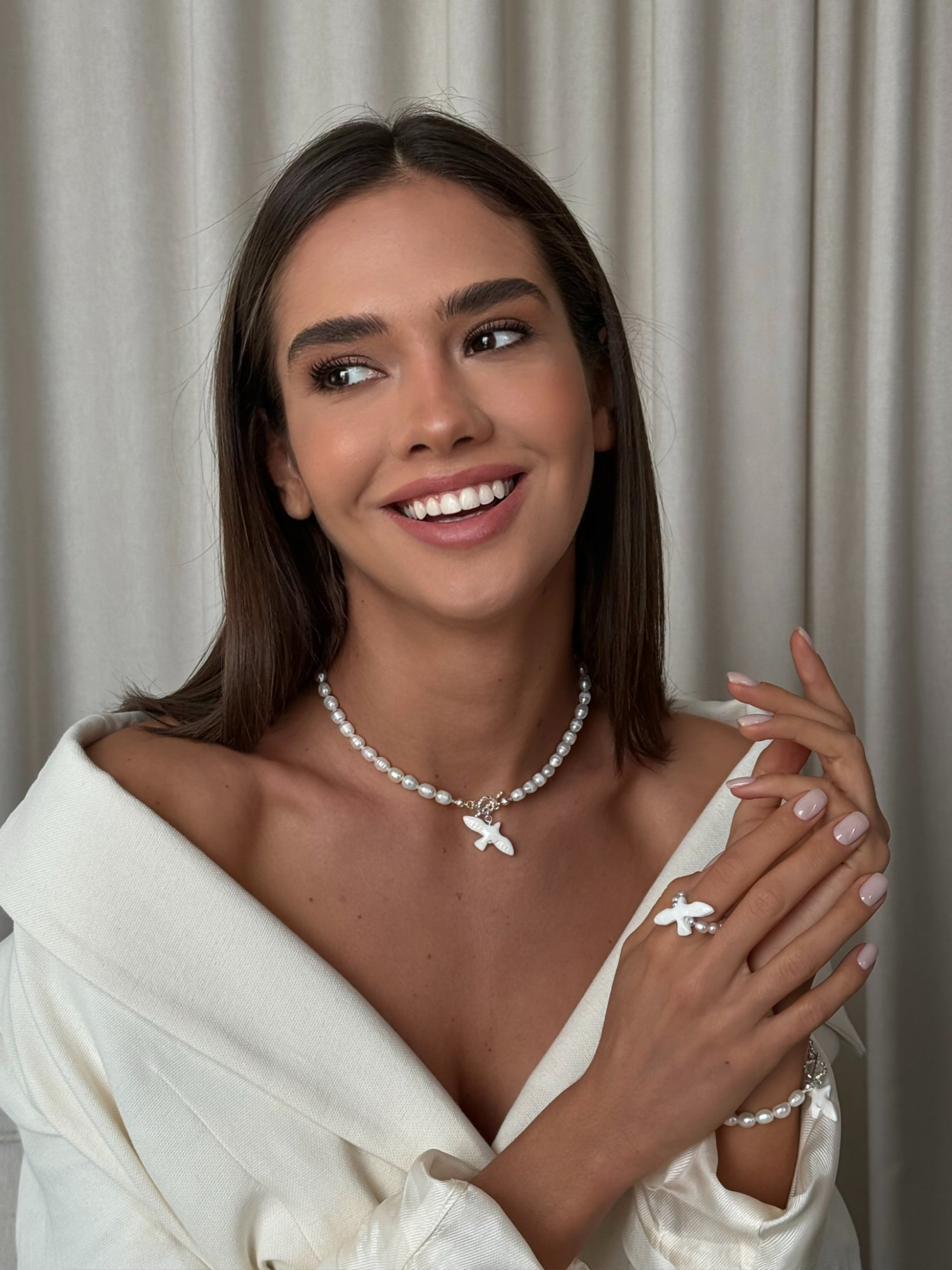 Це кольє стане чудовим вибором для тих, хто цінує: елегантність, красу та якість. Воно виготовлене з перлів, срібним покриттям та полімерної глини, що робить його не лише красивим, але й міцним.