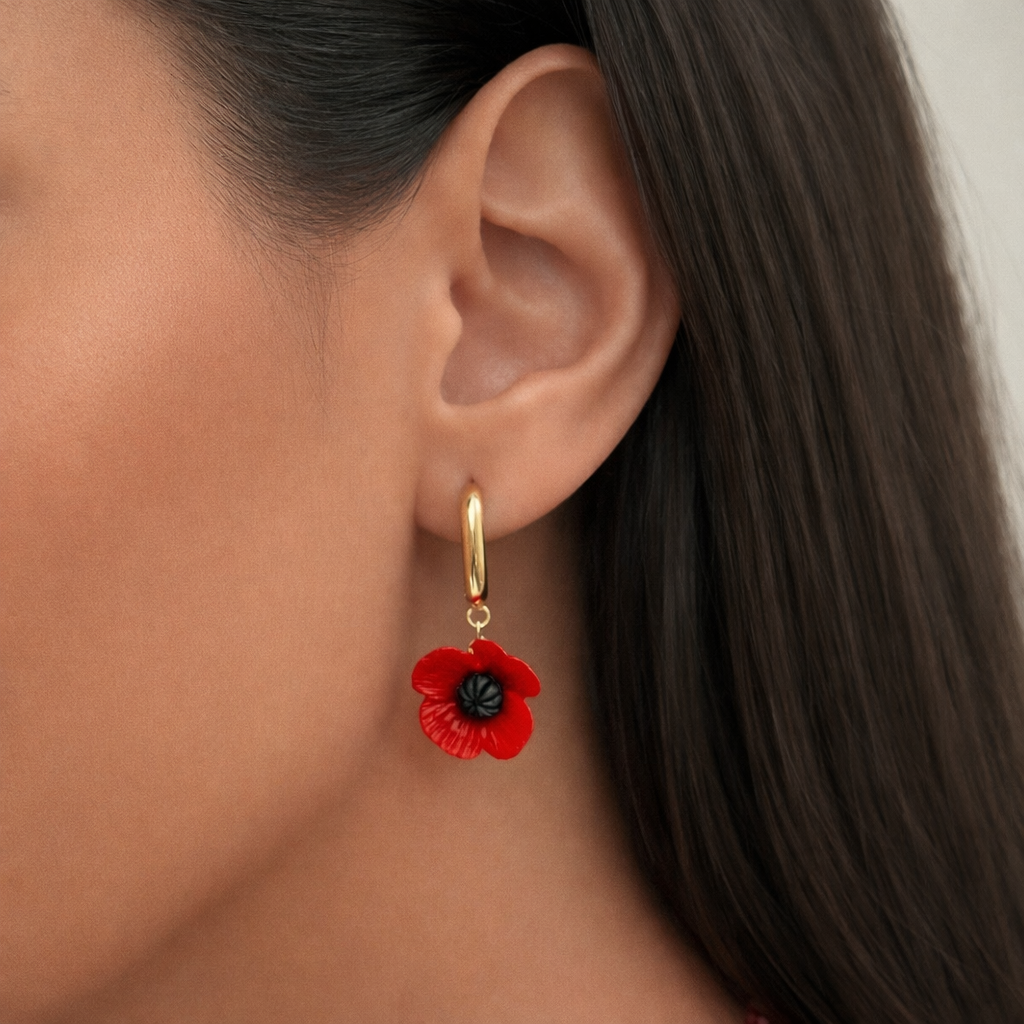 Ці витончені сережки з маками з полімерної глини стануть яскравим акцентом у вашому образі. Насичений червоний колір у поєднанні з позолоченою основою створює гармонійний та виразний дизайн.