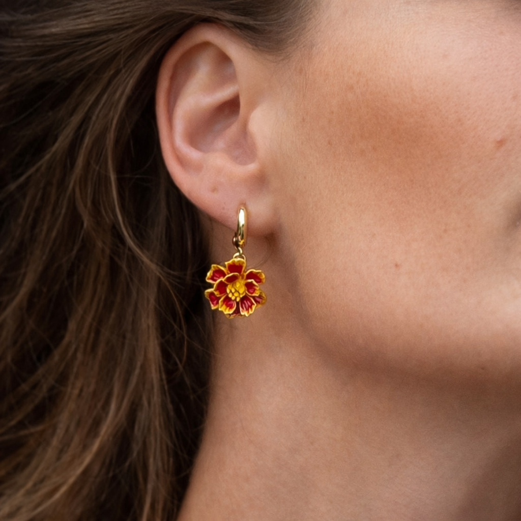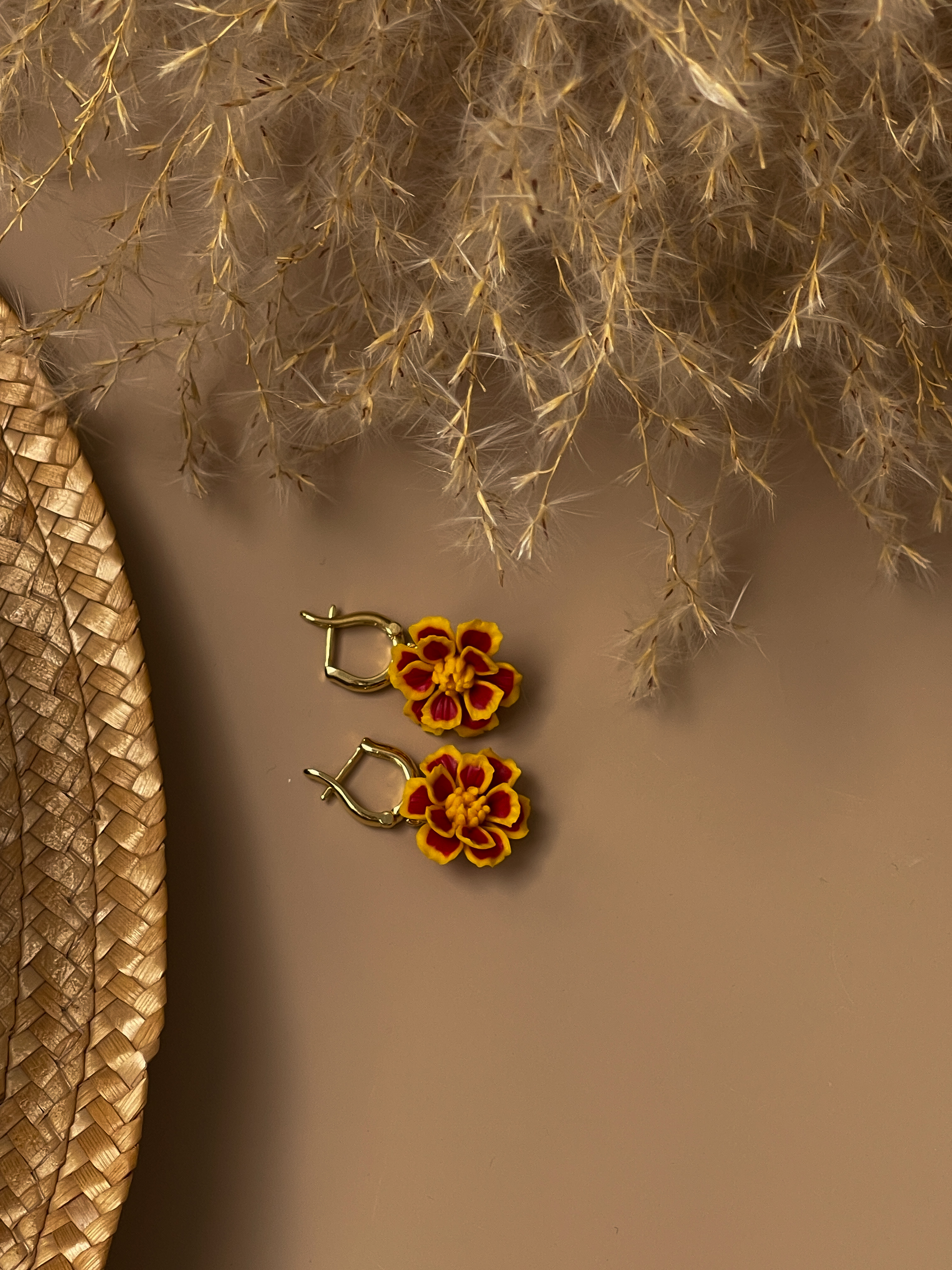 Ці сережки «Чорнобривці» — витончений акцент, що поєднує яскраву красу кулона-чорнобривця з полімерної глини та теплий блиск позолоти.
